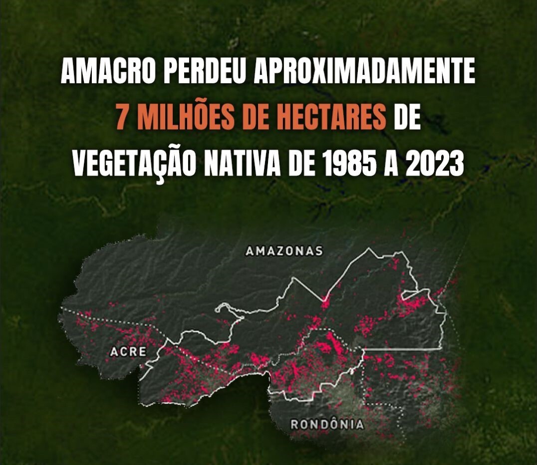 De acordo com dados do Instituto do Homem e Meio Ambiente da Amazônia (Imazon), a AMACRO, que compreende a região de fronteira entre os estados Amazonas, Acre e Rondônia, perdeu aproximadamente 7 milhões de hectares de vegetação nativa, de 1985 a 2023, para a conversão das áreas para o uso agropecuário, um território maior do que o da Irlanda.